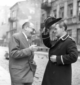 Stefan Wiechecki „Wiech” i Adolf Dymsza na planie filmu Bronisława Broka Cafe pod Minogą, Filmoteka Narodowa – Instytut Audiowizualny